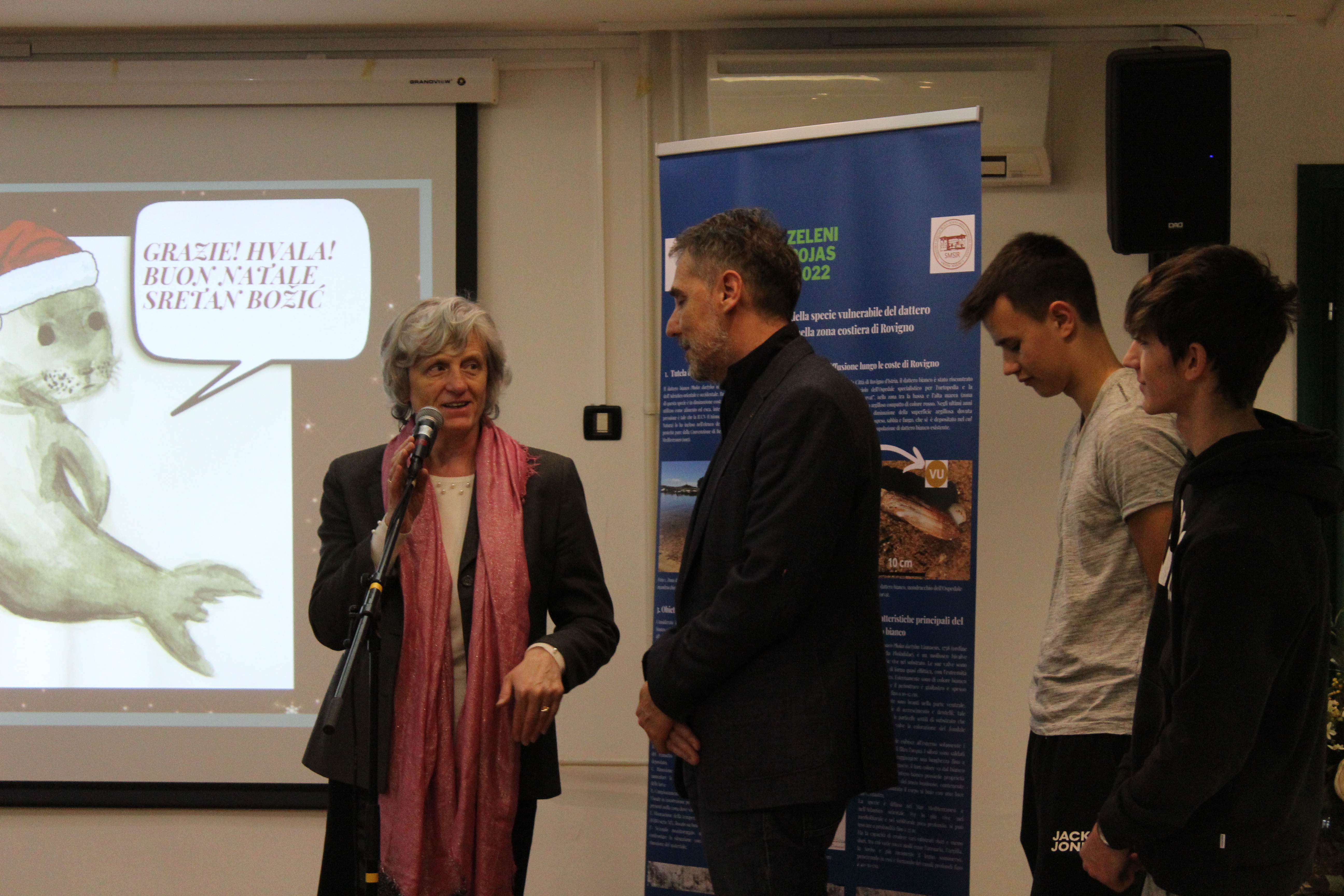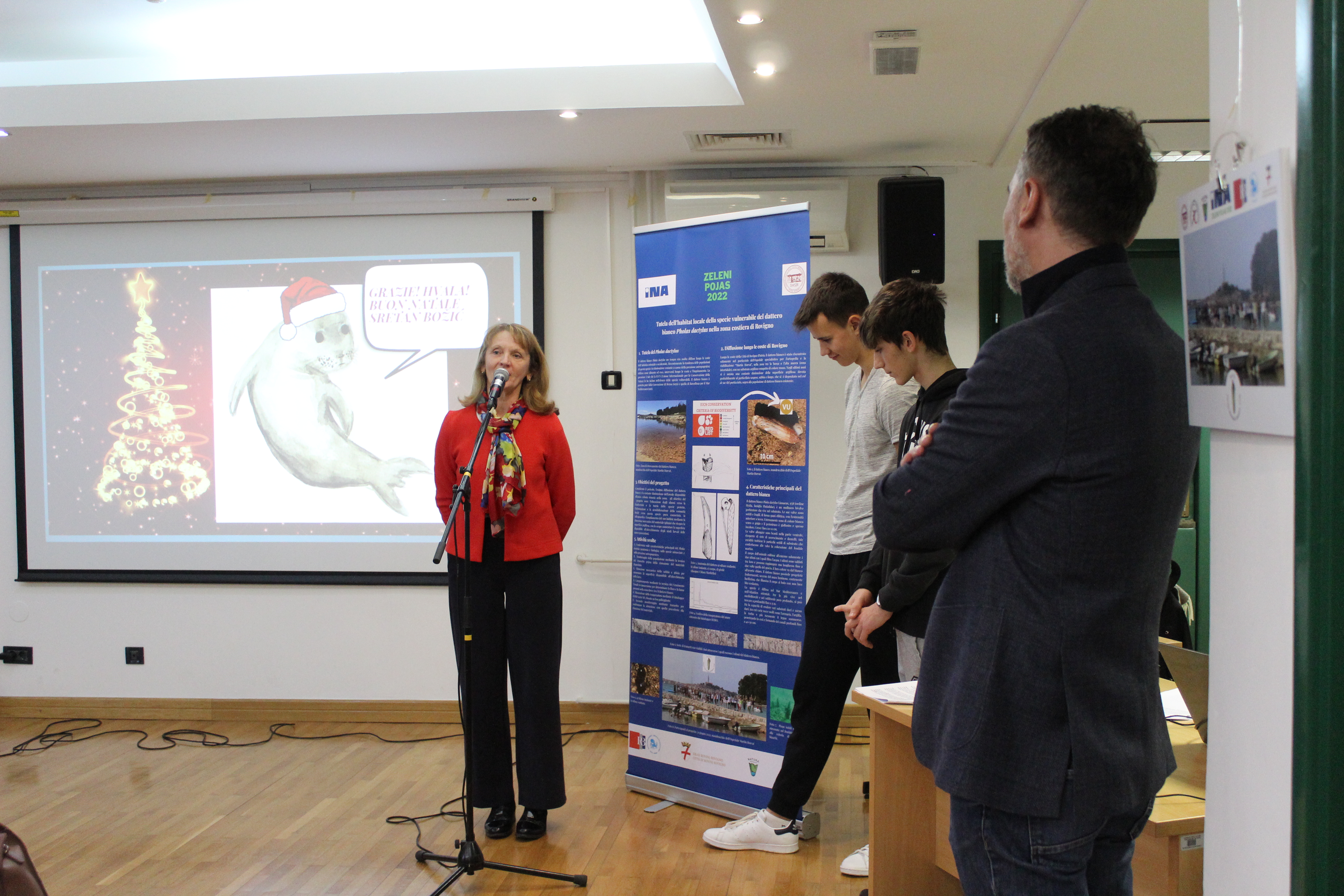 All'evento erano presenti anche la Direttrice dell'Ente regionale per la tutela delle aree protette, dott.ssa Silvia Buttignoni, i dottori in scienze del Centro per le ricerche marine di Rovigno, Andrej Jaklin e Bojan Hamer, la Preside della nostra scuola, prof.ssa Ines Venier, la professoressa Maria Orbanić accompagnatrice degli alunni della Scuola di Formazione professionale Eugen Kumičić, partner al progetto, e il coordinatore del progetto, il prof. mentore Daniele Suman.