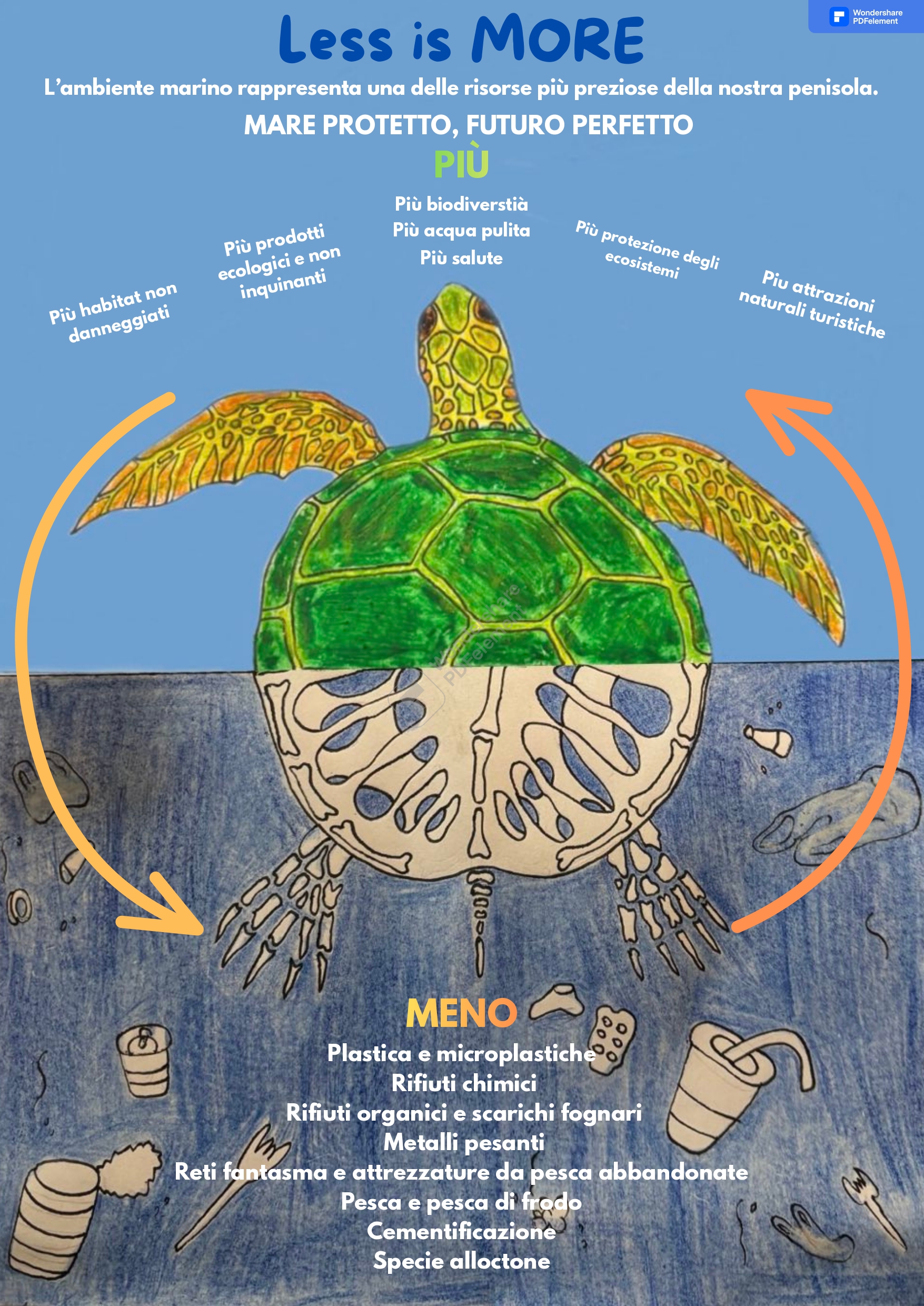Gli studenti della SMSI di Rovigno, guidati dal prof.mentore Daniele Suman hanno realizzato il poster “Less is More”, ispirato alla celebre frase dell’architetto Ludwig Mies van der Rohe, che valorizza la semplicità e l’essenzialità. Trasposto in chiave ecologica, il messaggio sottolinea come ridurre sprechi, plastica e sfruttamento significhi aumentare vita, bellezza e futuro per il mare. Il lavoro gioca inoltre sul doppio significato della parola More, che in croato significa “mare”, rafforzando l’idea che ogni scelta sostenibile restituisce qualcosa all’ambiente marino. Proteggere il mare, evidenziano gli studenti, non è un gesto simbolico ma un investimento concreto nella biodiversità e nella qualità della vita: un piccolo gesto in meno può trasformarsi in un mare in più.