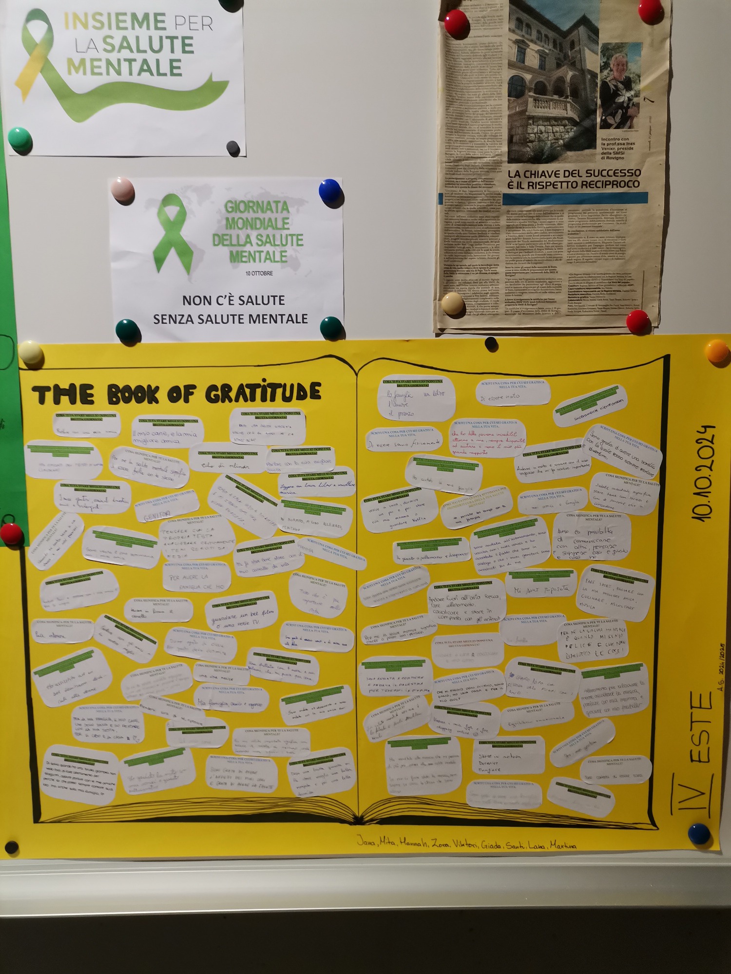Le allieve hanno preparato delle domande di riflessione sulla salute mentale e la gratitudine; in coppia, a turno, entravano nelle altre classi e distribuivano foglietti di carta ai ragazzi e ai docenti, chiedendo loro di scrivere una cosa per cui si sentivano grati nella loro vita. Gli studenti e i docenti poi inserivano i fogli nel "Barattolo della Gratitudine," un barattolo di vetro creato appositamente per raccogliere questi pensieri. Una volta raccolti i biglietti, le allieve hanno poi creato un grande "Muro della Gratitudine", incollando i foglietti raccolti ed esponendolo nella scuola. Questo muro ha permesso a tutti di vedere e riflettere sui piccoli gesti e pensieri di gratitudine espressi dai loro compagni e insegnanti, trasformando l'attività in un'esperienza condivisa di positività e consapevolezza.