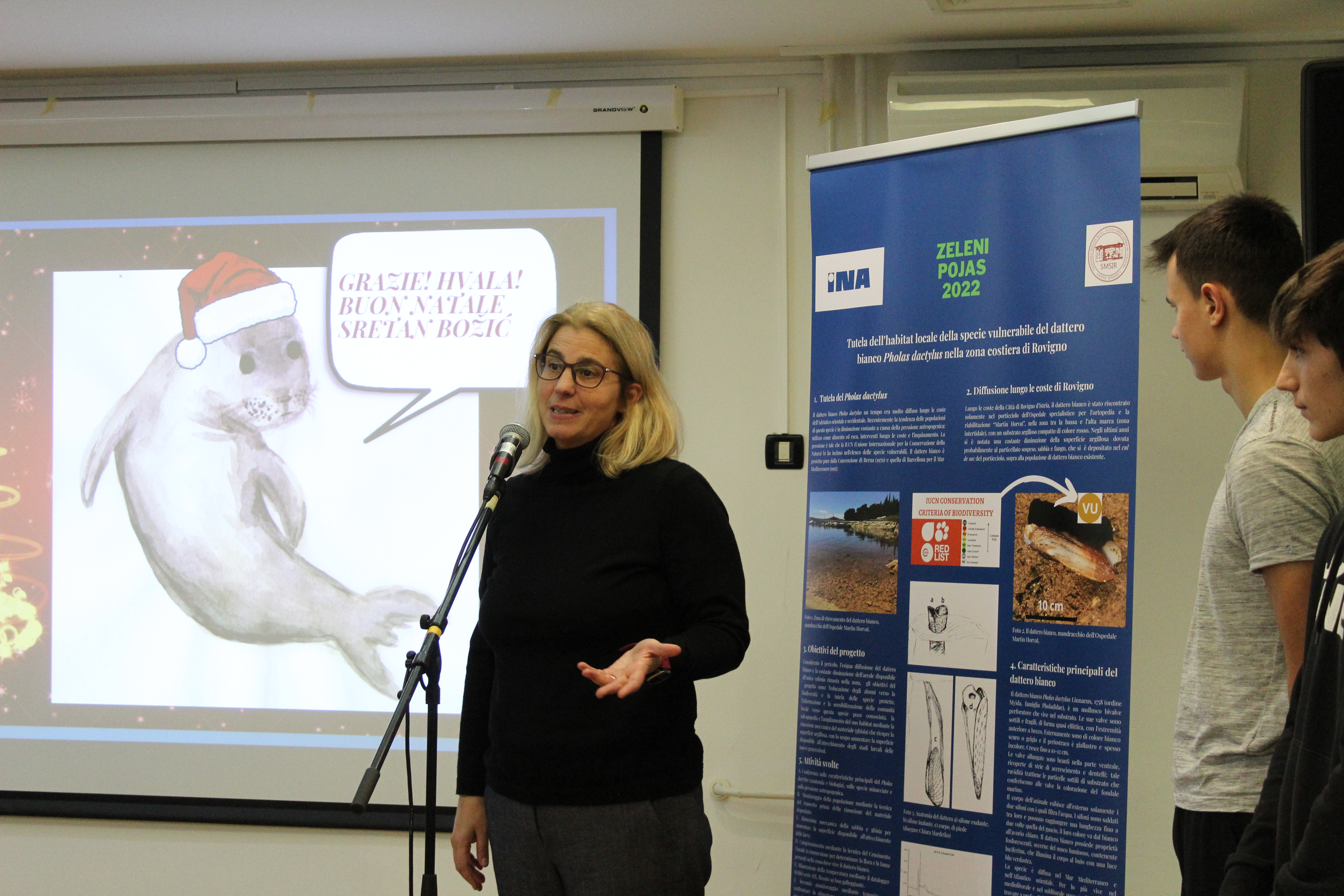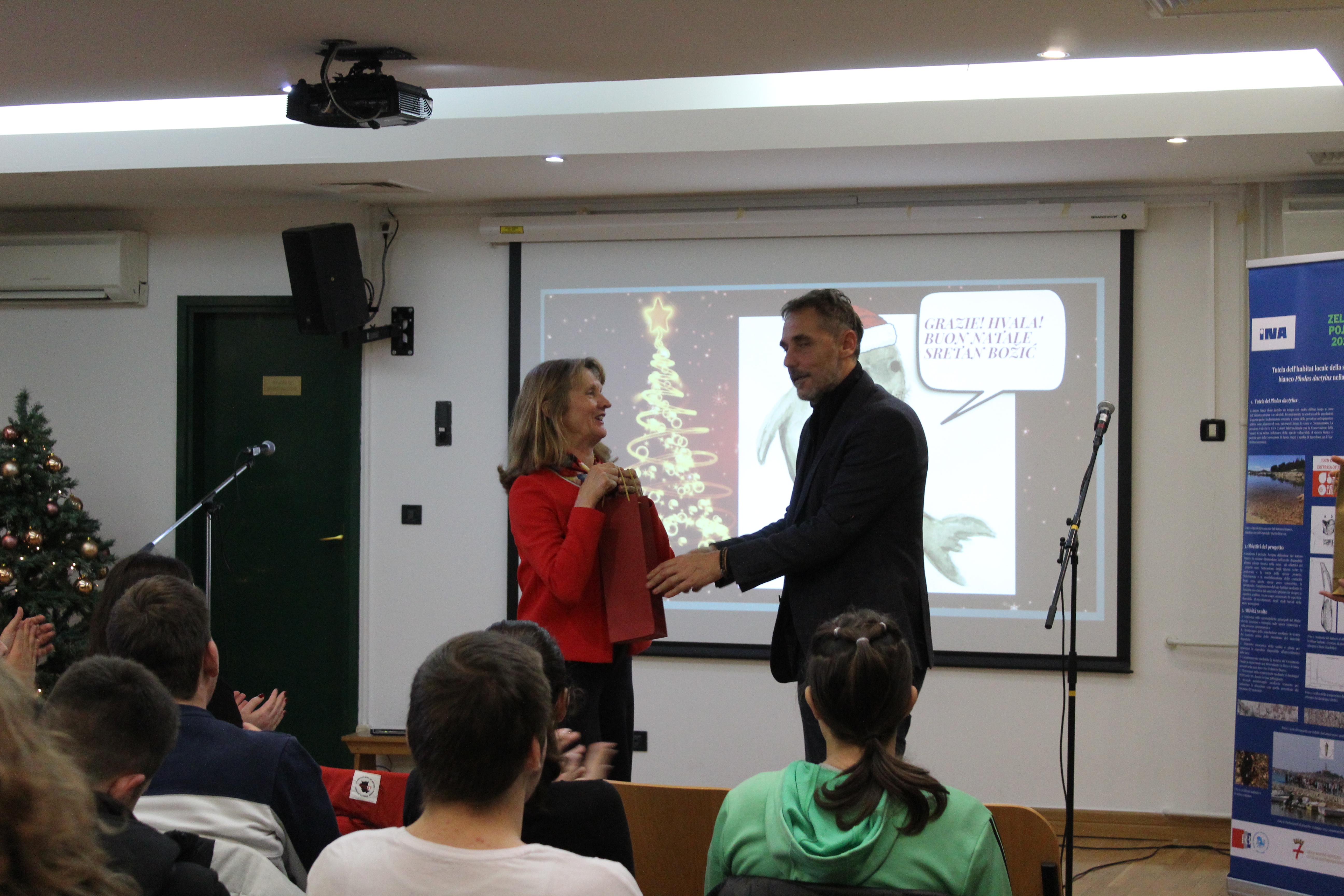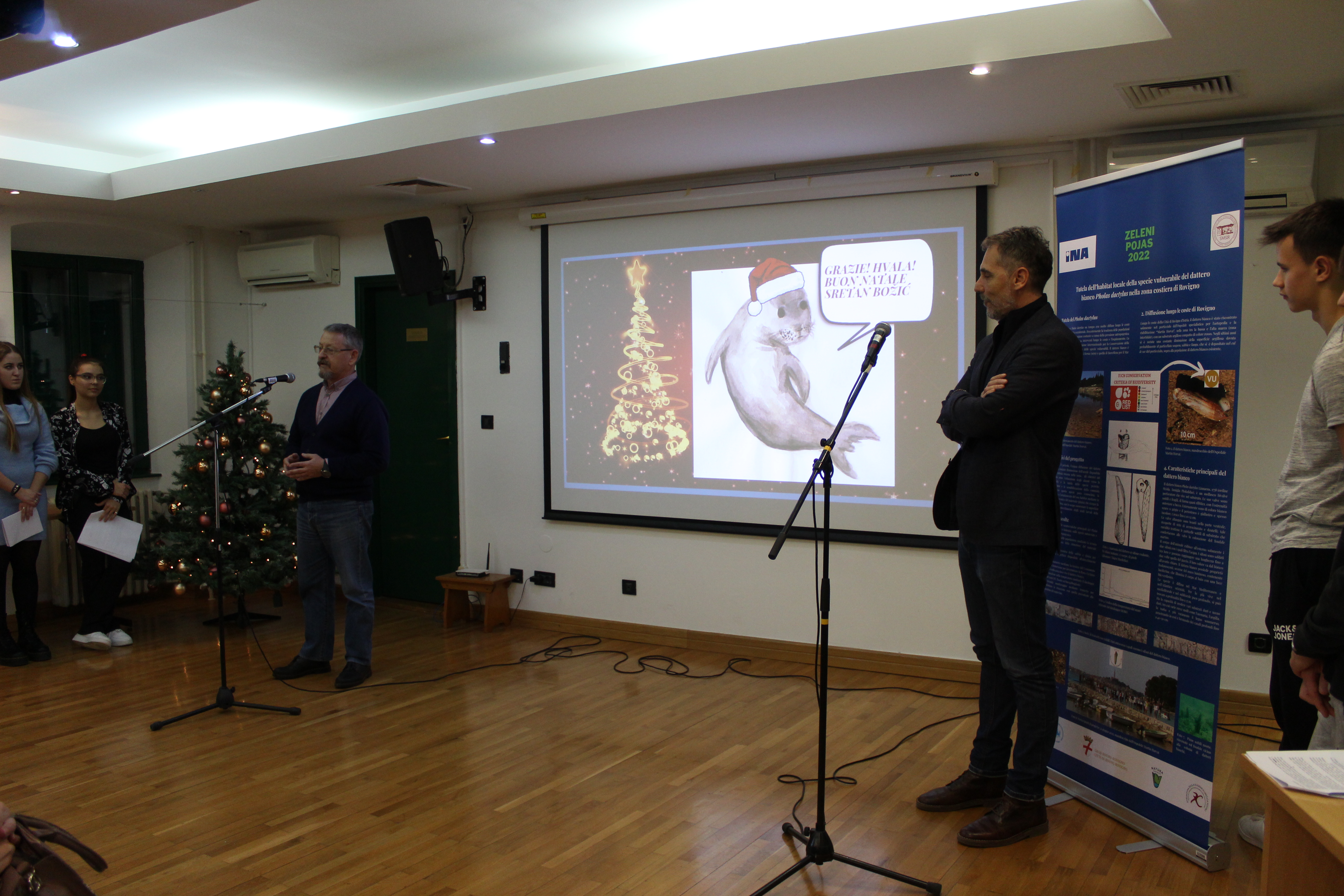 All'evento erano presenti anche la Direttrice dell'Ente regionale per la tutela delle aree protette, dott.ssa Silvia Buttignoni, i dottori in scienze del Centro per le ricerche marine di Rovigno, Andrej Jaklin e Bojan Hamer, la Preside della nostra scuola, prof.ssa Ines Venier, la professoressa Maria Orbanić accompagnatrice degli alunni della Scuola di Formazione professionale Eugen Kumičić, partner al progetto, e il coordinatore del progetto, il prof. mentore Daniele Suman.