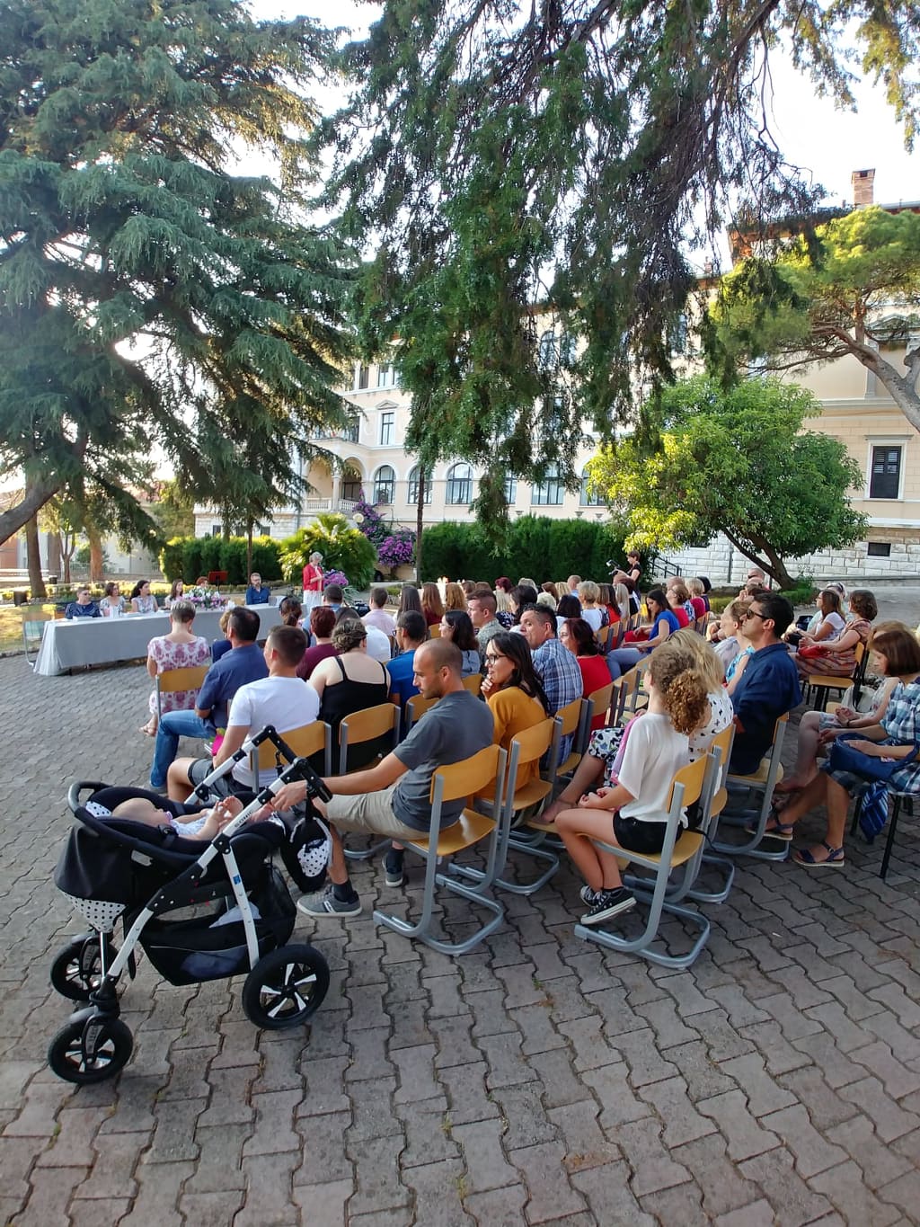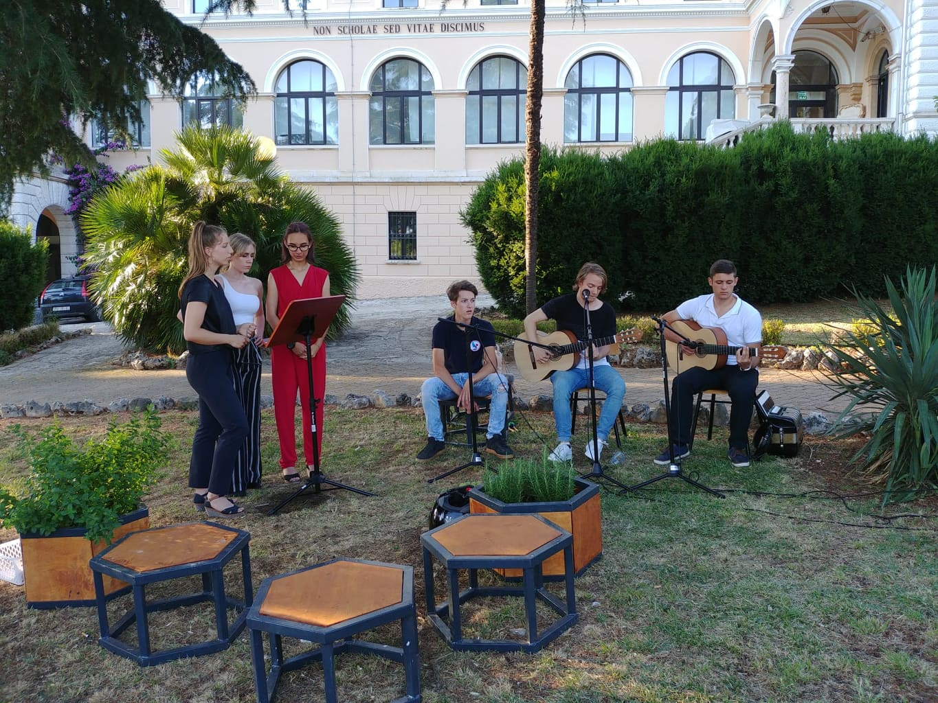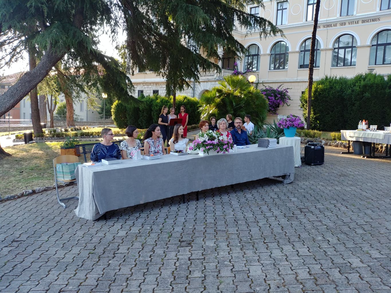 La cerimonia si è tenuta nel suggestivo giardino che circonda l'edificio scolastico, mentre a rendere frizzante l'atmosfera sono stati gli alunni delle classi I e II che si sono esibiti con alcune canzoni. La serata si è conclusa con il taglio della torta.
